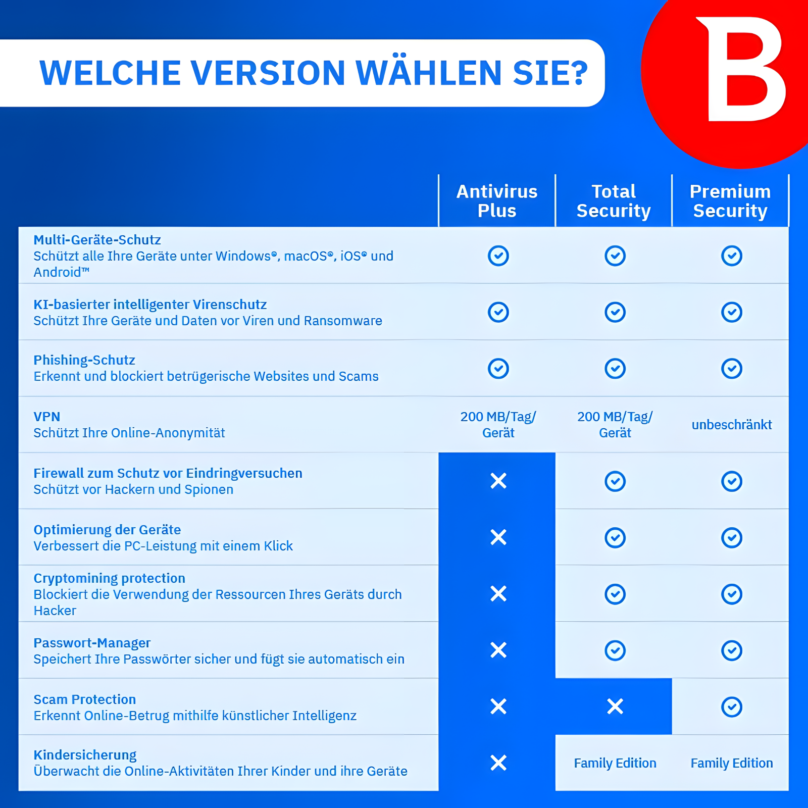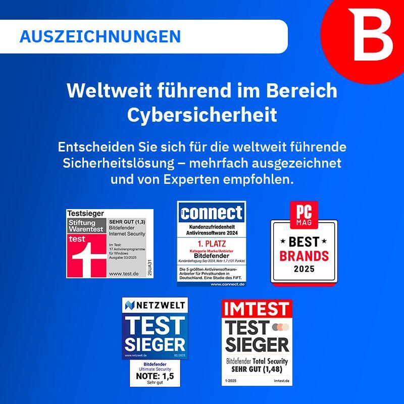 Bitdefender zählt seit Jahren zu den meistausgezeichneten Sicherheitslösungen weltweit – regelmäßig empfohlen von unabhängigen Testlabors wie AV-TEST und AV-Comparatives. Die 1-Jahres-Lizenz ist kein Abo: Sie verlängert sich nicht automatisch, und es werden keinerlei Zahlungsinformationen hinterlegt. Nach Ablauf entscheiden Sie selbst, ob und wie Sie verlängern möchten.
