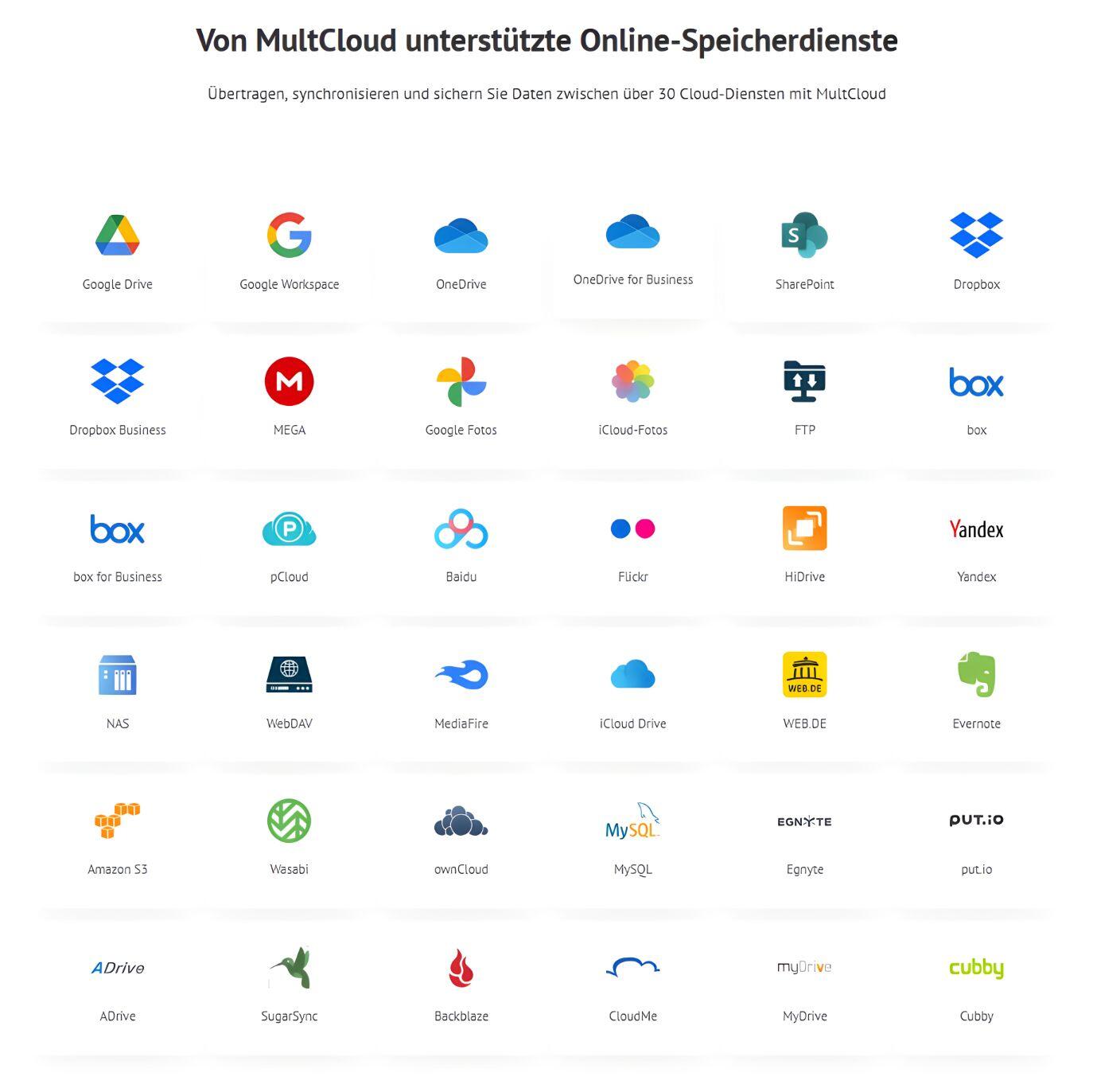 ✔️Kompatibilität: MultCloud unterstützt eine Vielzahl von Cloud-Diensten, darunter die beliebtesten Anbieter sowie einige Nischenlösungen: Google Drive, Dropbox, OneDrive, Box, Amazon S3, MEGA, FTP, WebDAV und viele mehr.