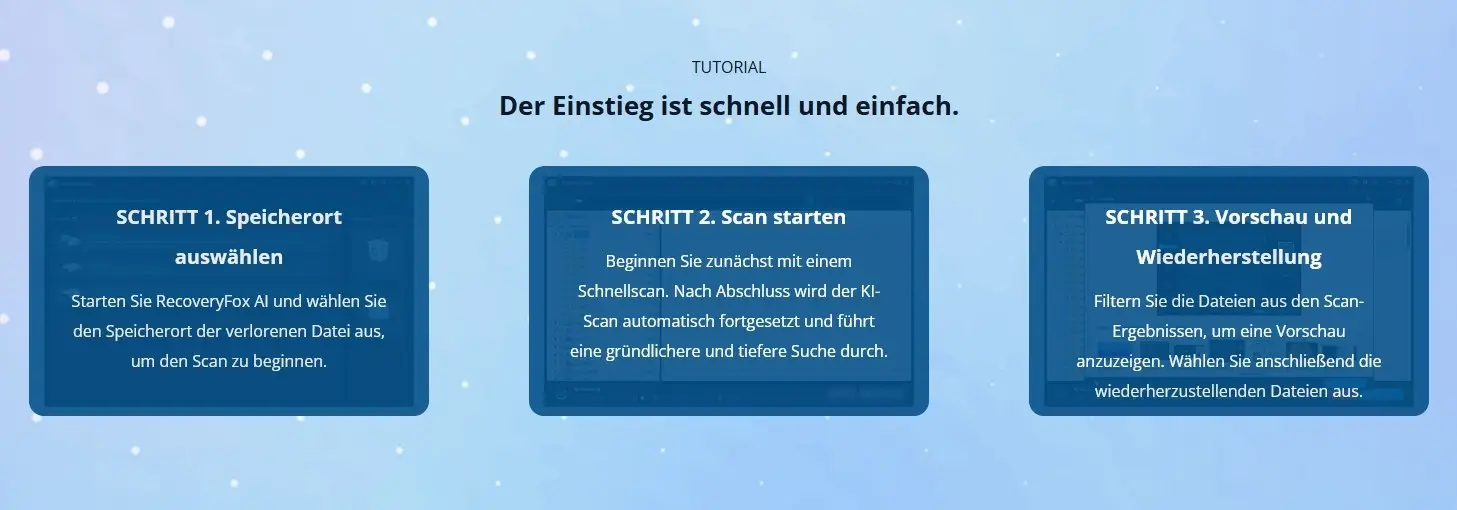 ✔️Einfache Bedienung: Die benutzerfreundliche Oberfläche führt Sie Schritt für Schritt durch den Wiederherstellungsprozess, sodass Sie Ihre Daten mit wenigen Klicks zurückgewinnen können.